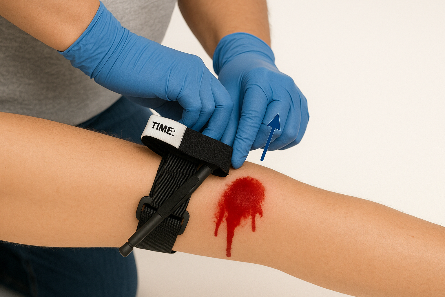 - En caso de una hemorragia potencialmente mortal en una extremidad que no se controle con presión manual directa, aplica un torniquete lo antes posible.